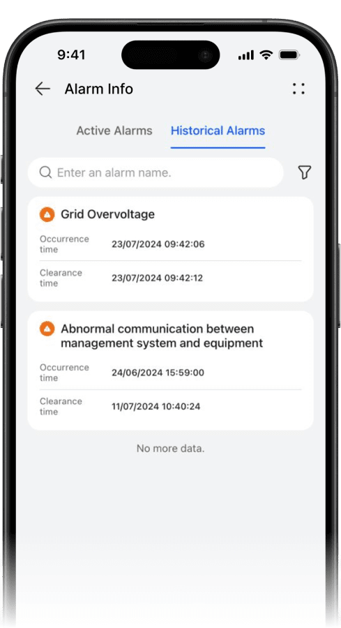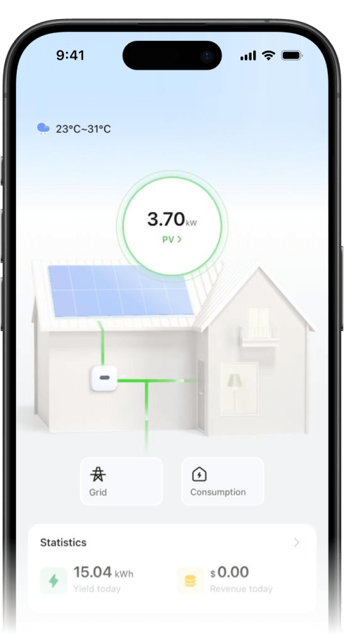 Gain instant peace of mind with our user-friendly app. Get a clear overview of your system's performance, including real-time energy generation (kWh), weather data, and system health indicators (green for good connection)