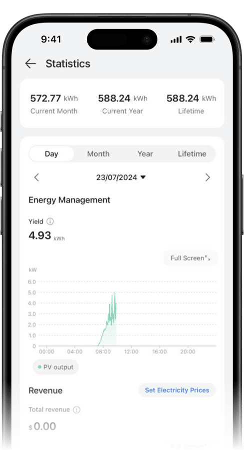 Uncover valuable insights with detailed historical data. Track your solar panel's total energy production for the month, year, and lifetime. View interactive charts to analyze energy production and revenue trends over time.